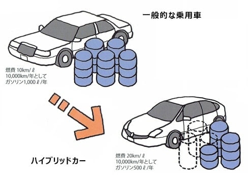 エコカーが燃費20㎞/ℓだとすると、従来の車(燃費10㎞/ℓ)と比べて半分の燃料で同じ距離を走行できます。